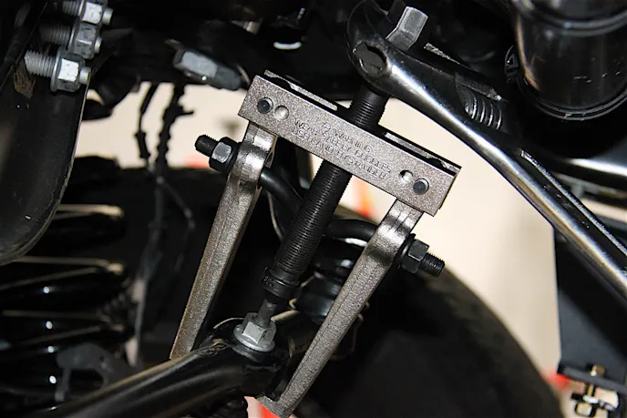 Up front, things were substantially harder in terms of complexity, but we knew we could do it. We started by moving the brake line hold-down bracket to allow for vertical travel. Next, we unbolted the Panhard bar on the left side.