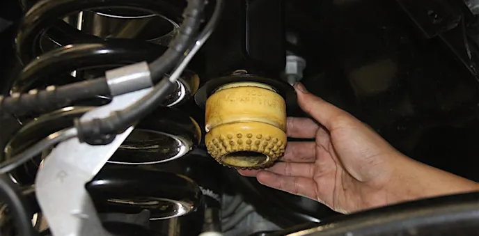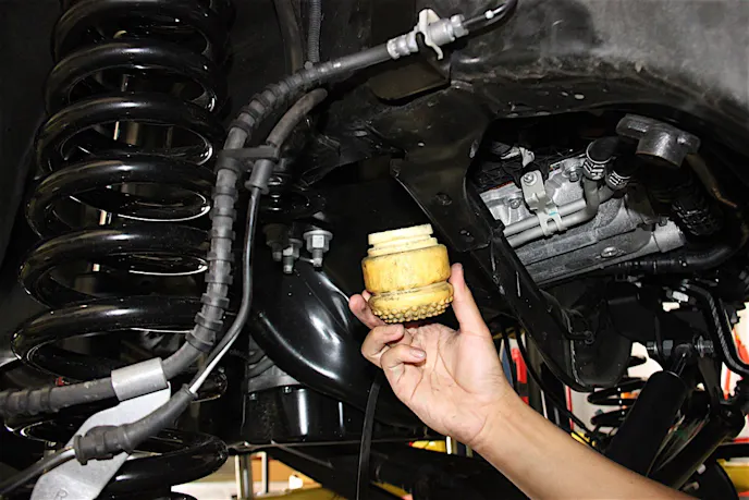 Now, we went after the bump stops. They were removed by hand. The retaining cups were held in by bolts, which we undid. The new bolts received thread locker to help keep them in place for the long haul. The old bump stops were reused.