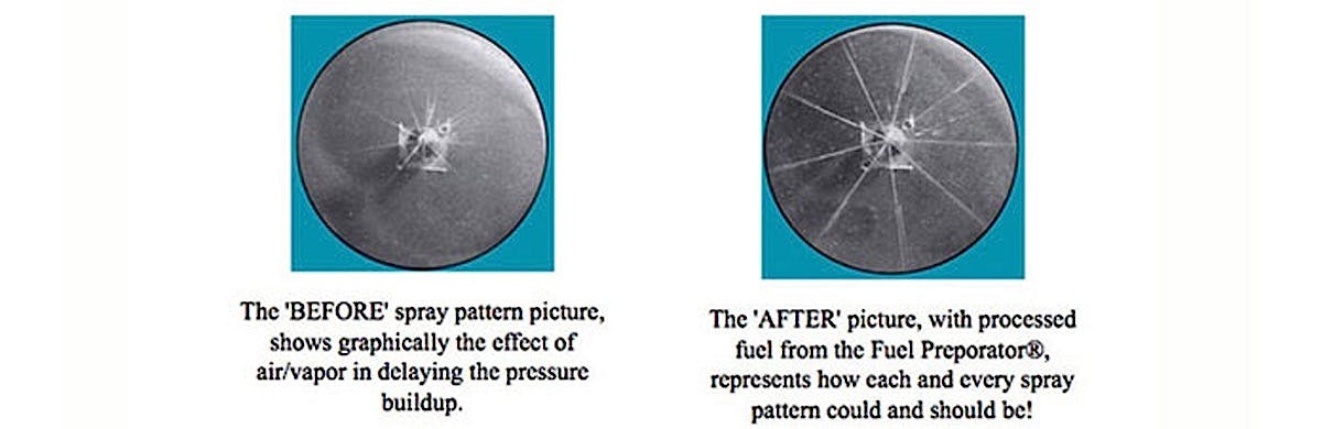 Entrapped air occurs when diesel fuel is sloshed and agitated in the tank, forming bubbles. These tiny bubbles are suspended in the diesel fuel and do not rise to the surface of the fuel as quickly as gasoline because of the increased viscosity of diesel. Unable to escape the suction of the fuel pickup, these bubbles are drawn into the fuel system and travel downstream.before-after