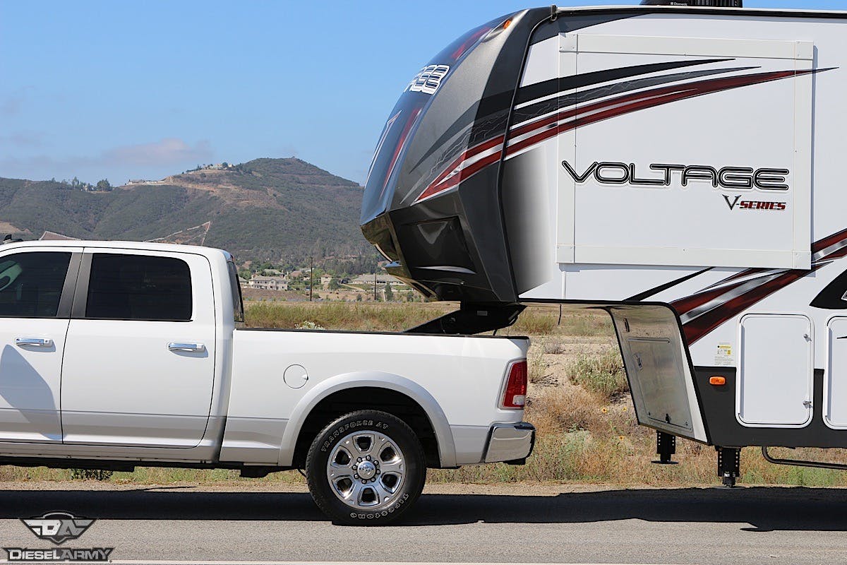 As an example of a truck needing a sway bar upgrade and airbags, we installed a set of Hellwig sway bars on our friend Donnie’s 2014 Dodge Ram 2500. Donnie tows a 2015 Voltage V-Series fifth wheel around the country. When loaded down for a trip, this load comes in at around 18,000 pounds, just a hair outside the maximum capacity of this already high-load truck. A family man and sports enthusiast, Donnie places a high priority on the safety of his family so uprating the stability of his towing rig is a clear decision.
