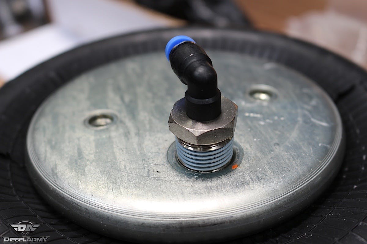 With the sway bar upgrade complete, we turned our focus to the airbag assembly. Hellwig’s kits stand apart from competitors in that they use the largest airbags possible to fit under a truck. Ben Knaus explained that the 2,800-pound bags in our kit are larger than the competition so they require less air pressure to level a load, which means a better ride quality. The kit comes with a variety of brackets with different hole patterns, countersunk hardware, studs, nuts, bolts, and even thread lock compound to make your life easier. While working at a bench, we installed the supplied air fittings equipped with push-lock quick-disconnects.