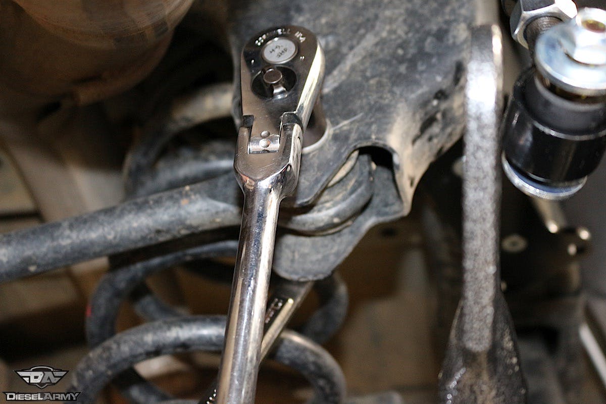 Starting in the front end, we got the truck up in the air and began removing the OEM front sway bar. Two links, and two bushing clamps later, we were rid of the stock component and could compare the size difference between the Dodge and Hellwig parts.