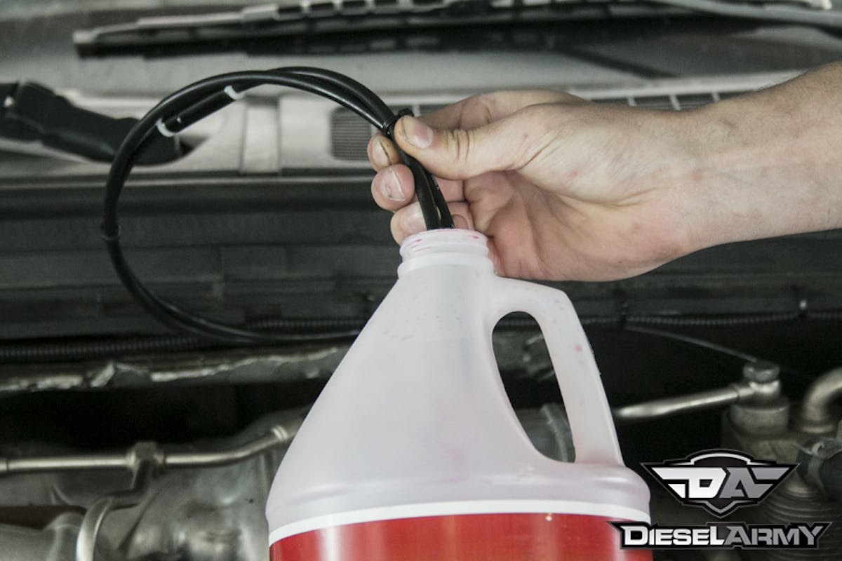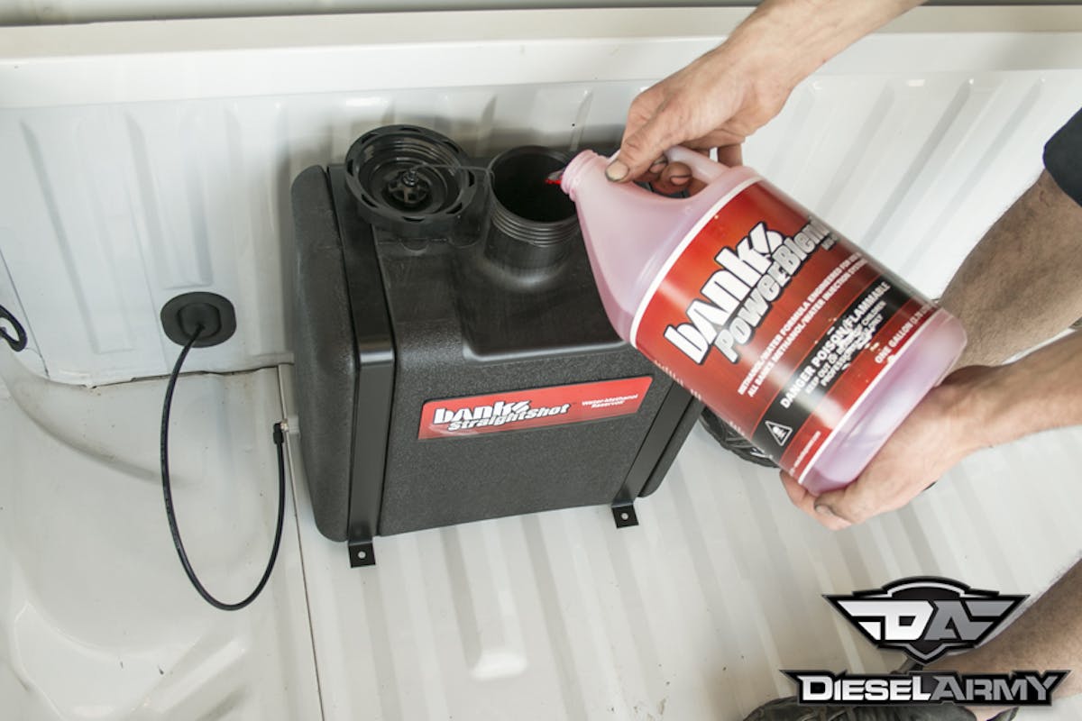 Once the system was full hooked up, Young filled the reservoir mounted in the truck with some of the Banks PowerBlend.