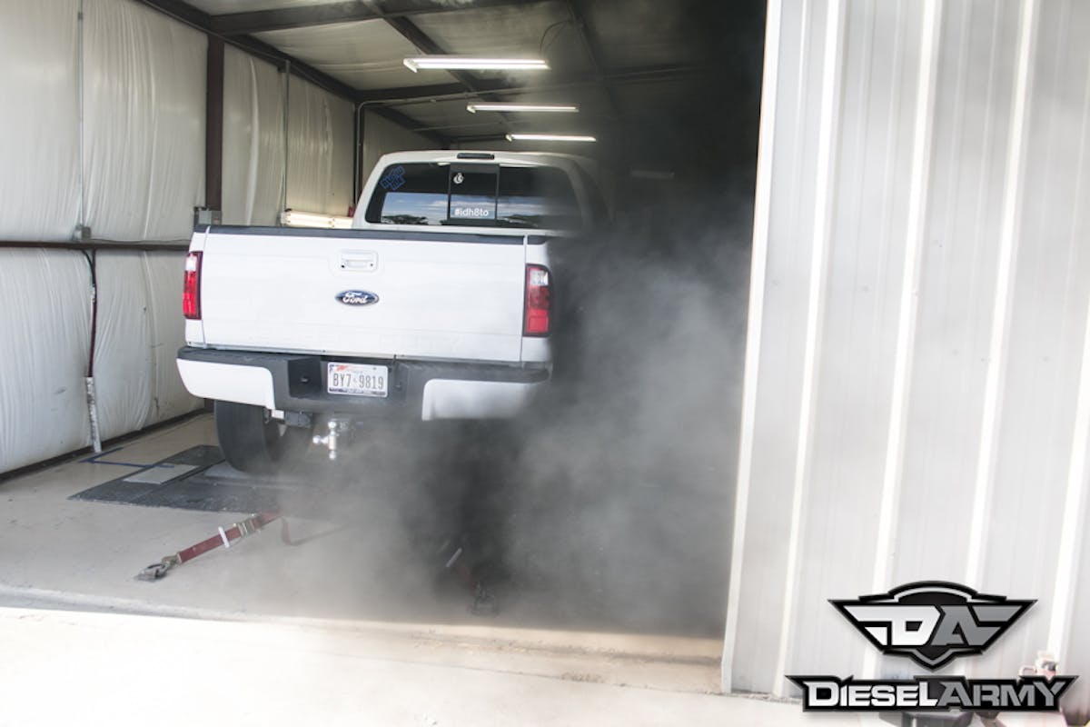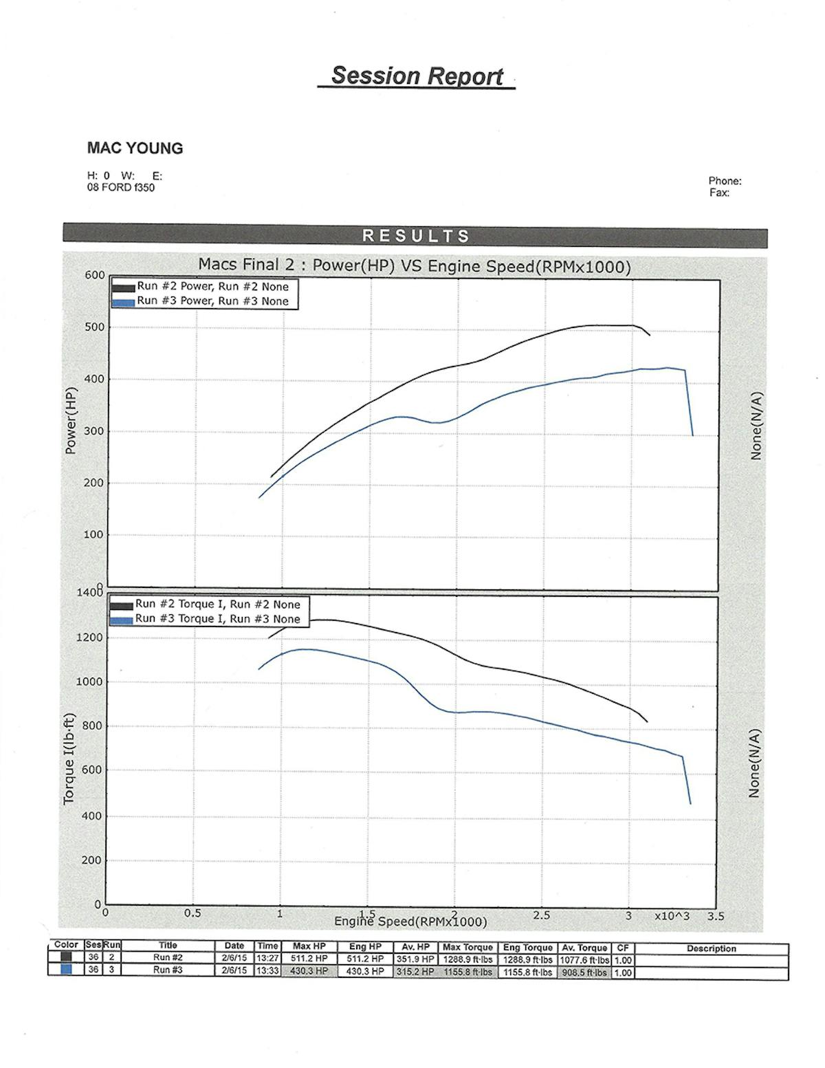Back_To_Back_Dyno_Water_no_Water_Macs_TruckThe truck was backed out of the bay and driven over to the dyno. Multiple pulls were made to get a good baseline on the horsepower and torque number. The truck has had quite a few engines in it over the past 300,000 miles and we wanted to make sure we were getting a repeatable number. With the truck running a tow tune, it was laying down anywhere from 423 horsepower to 430. The torque was pretty consistent too, peaking out at 1155 lb-ft of torque plus or minus 10 lb-ft.