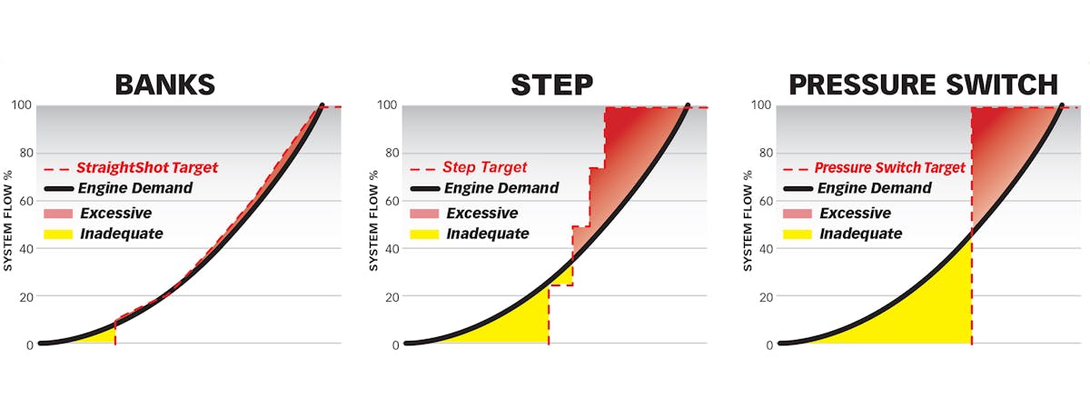 “Since then, what companies are doing is more of a step function. So they may have the pump operating a 25%, 50%, 75%, or 100% duty cycle based on boost levels or whatever they have set up. They have more of a step function. In both those cases, you can never quite match what the engine demand is,” explained Treydte.