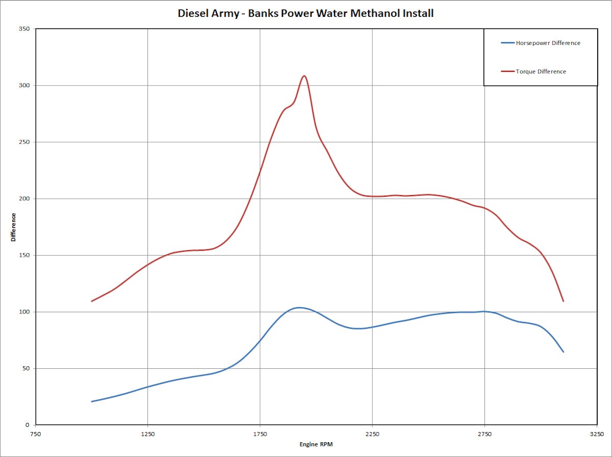 The truck produced over 100 lb-ft of torque more from 1,000 rpm to 3,100 rpm when Young let off. There was actually a peak increase of 308 lb-ft of torque at 1,950 rpm. If you look at the graph below, you will notice from just about 1,700 rpm to 2,700 rpm (the common RPM when towing) the Banks Power water/methanol injection system was producing at least 200 lb-ft of torque more. That will certainly make a difference climbing a hill, passing a vehicle, or merging onto the freeway.