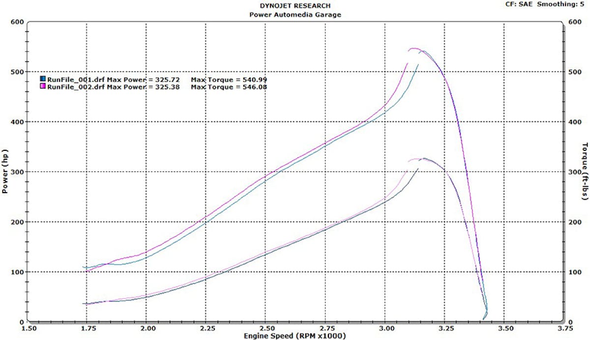 We asked Trent McGee over at Airaid to tell us a little more about the system, “The Airaid MXP Series Intake Systems are designed to bolt into place (there’s no drilling or trimming required) and work right out of the box with no tuning required. The complete replacement airbox adds several cold air inlet ducts, while the oversize filter and replacement intake tube optimize airflow to the engine, and more air equals more power. Our systems increase power, lower EGTs, and improve fuel mileage all at the same time.” Below you can see our high run gave us 325.72 hp and 546.08 lb/ft of torque.