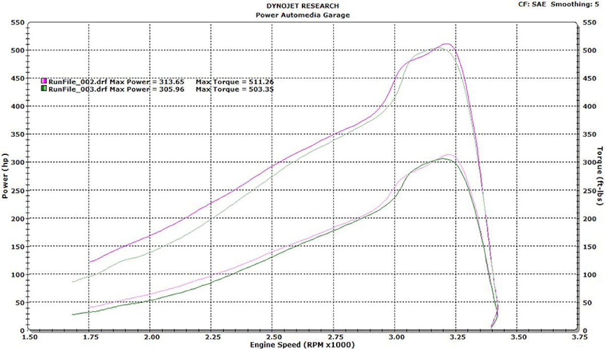 In gauging what to expect, we checked their website and found Bully Dog’s Rapid Flow Air Intake System delivers cold, dense air to the vehicle’s engine, outperforming OEM air intakes by providing additional horsepower, torque and fuel efficiency. Our numbers came in at 313.65 hp and 511.26 lb/ft of torque. Bully Dog’s enclosed intake system helps keep hot air out of the intake stream by targeting cold air sources specifically designed to optimize airflow and the high-flow 8-layer cotton gauze filter provides maximum filtration to protect your motor without limiting airflow.