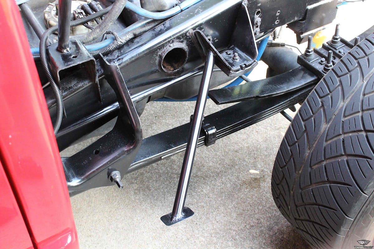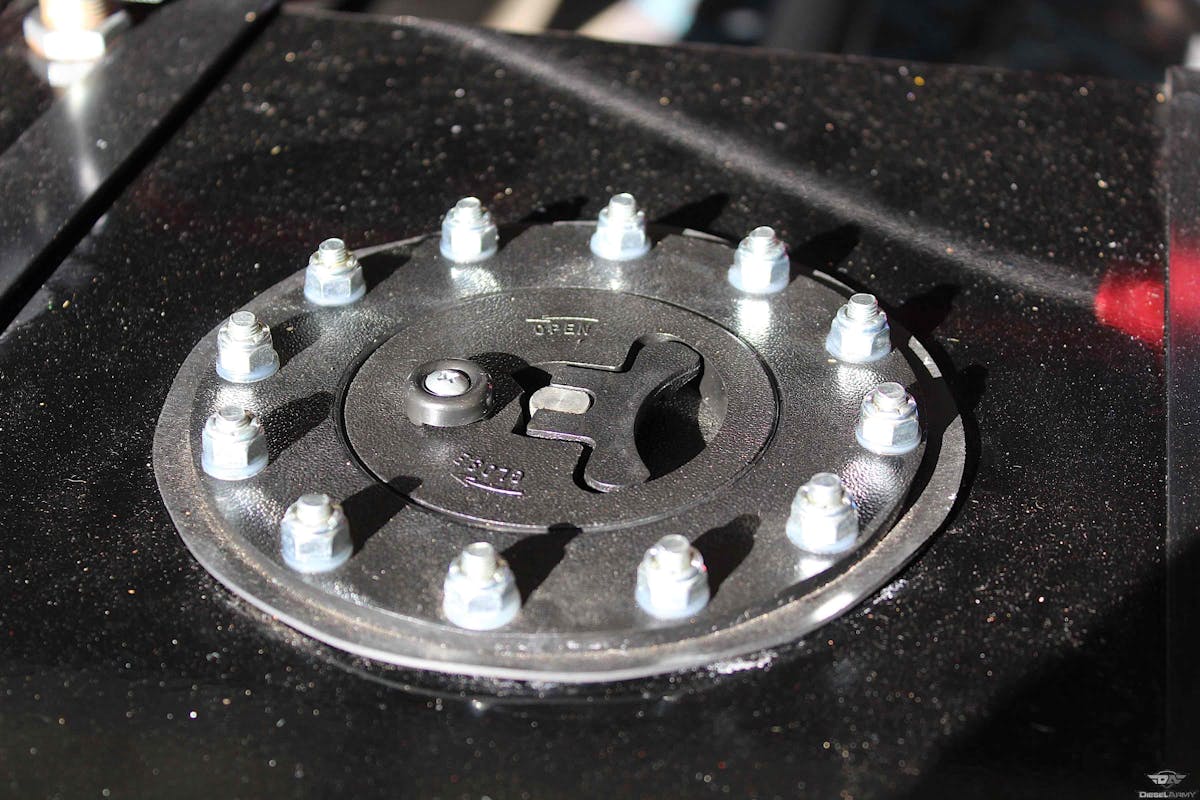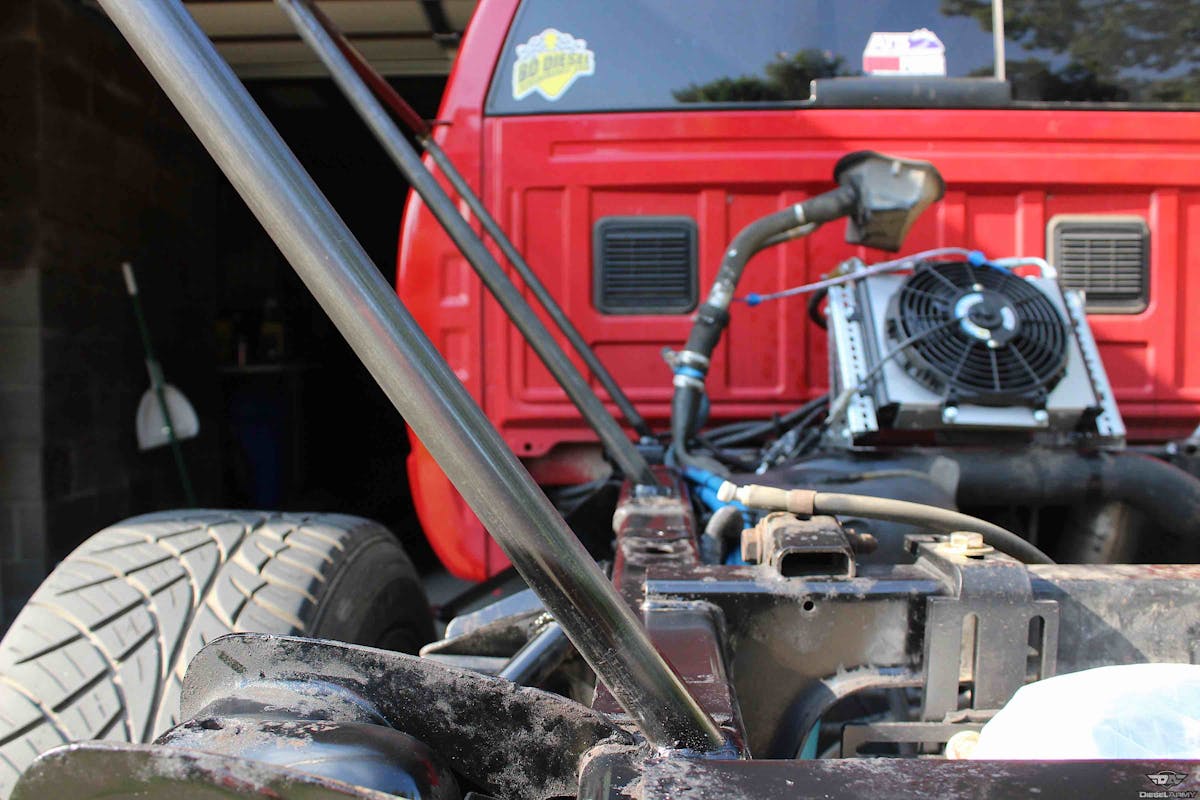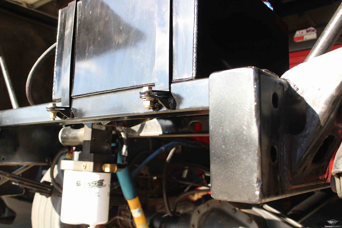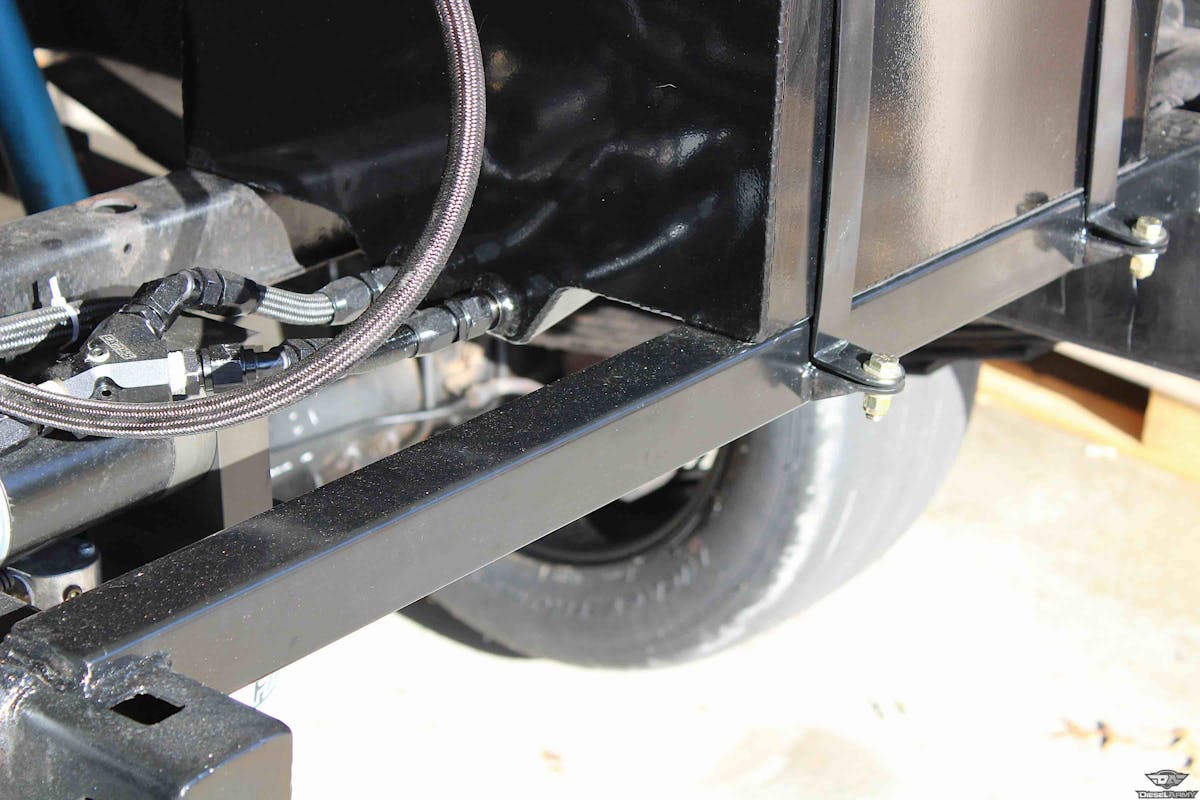 Using our Earl’s Performance Plumbing fittings, we’ve got our fuel cell plumbed to our FASS and all the way up to our twin CP3 injection pumps. We didn’t equip our fuel cell with the strapping system. We ended up turning to JK Fabrication, of Gordonville, Missouri to fabricate a strapping system and cage around the cell that would incorporate the frame rails for a cleaner look.