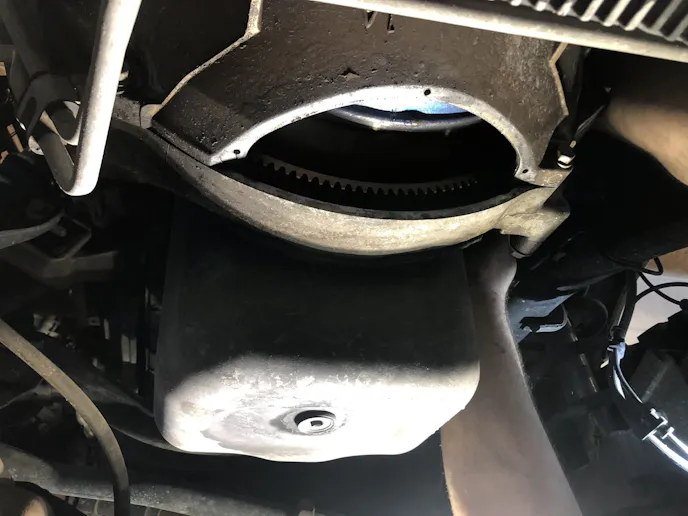 We separated the transfer case and the old transmission and got it mounted to the new transmission while out from under the truck. Once we persuaded it into its new home, everything began going back together in reverse. Reinstalling the crossmembers, inflow and outflow lines, and getting the new torque converter tight to the flexplate, we were ready to set it down on the ground.