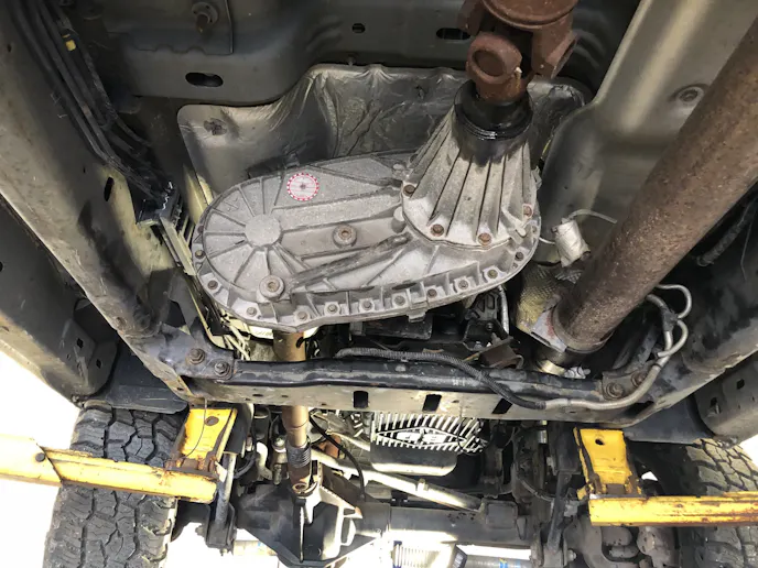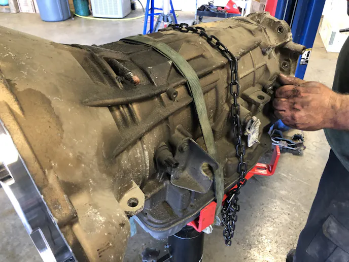 We took the truck to Scheeter Auto & Diesel for the teardown and up on the lift it went. The driveshaft came out, the transfer case and transmission crossmember were loosened, the transmission jack went underneath for support, and out it all came. Taking it out seemed like a pretty easy chore.
