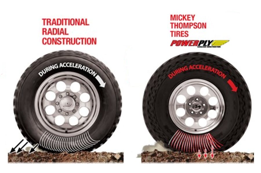 PowerPly construction refers to Mickey Thompson’s innovative twist on plies in tires. It is a carcass construction that lessens the twist in a tire, making for a faster response in steering.