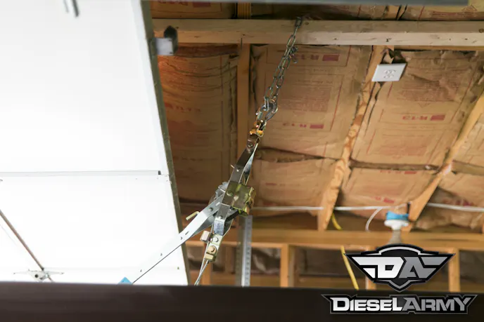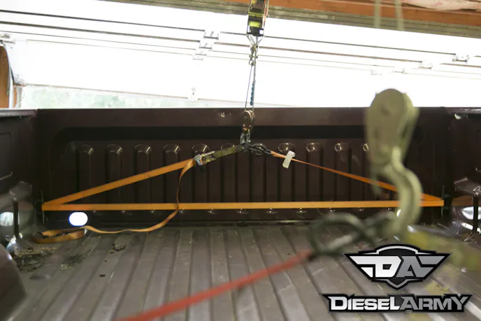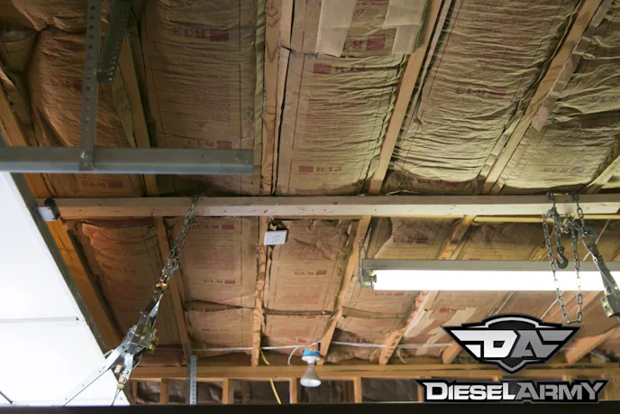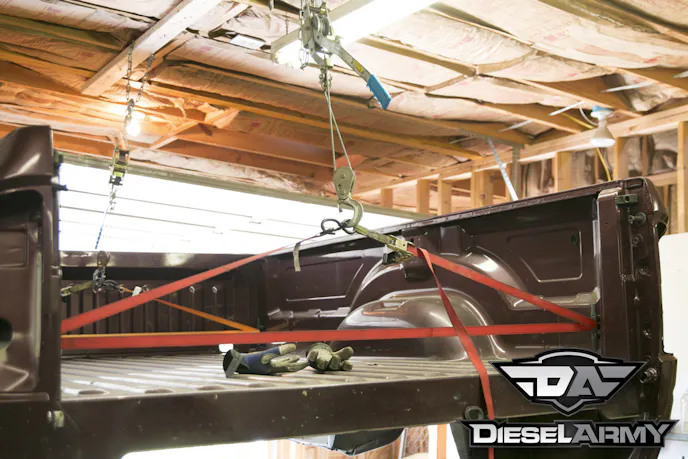 Without a lift or any way of picking up the bed, we simply screwed a 2×4 to the rafters in a number of places and then used two Come-Alongs to lift it.