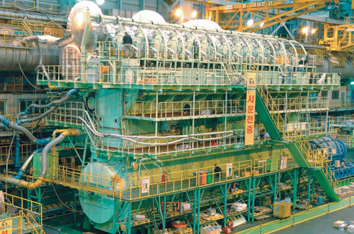 Considering the crankshaft alone weighs 300 tons, it’s intriguing to consider how its contours were shaped, and so it is with the piston and rod assemblies, which push conventional thinking right out the exhaust pipe. Unlike typical pistons and rods in automotive applications, the top of the connecting rod isn’t attached to the piston, but to a crosshead rod extending to the piston high above. Think of steam locomotives a century ago, and you’ll recognize the concept. Crosshead pins with guide shoes ensure the crosshead maintains its linear motion thereby keeping the cylinder walls circular. This approach also centralizes the forces exerted during combustion, thereby increasing efficiency.