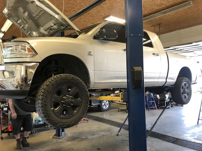 We took the truck to Scheeter Auto & Diesel for the teardown and up on the lift it went. The driveshaft came out, the transfer case and transmission crossmember were loosened, the transmission jack went underneath for support, and out it all came. Taking it out seemed like a pretty easy chore.
