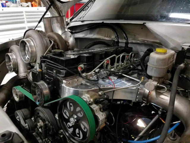 Airflow into and out of the big Cummins is currently handled by a trio of Forced Inductions turbos with a massive 102mm GT55 on the manifold and a pair of 88mm GT5018 turbos sucking air in from the atmosphere. To keep up with all of that airflow they turned to Dynomite Diesel Products for a set of their 800% over Super Mental injectors.